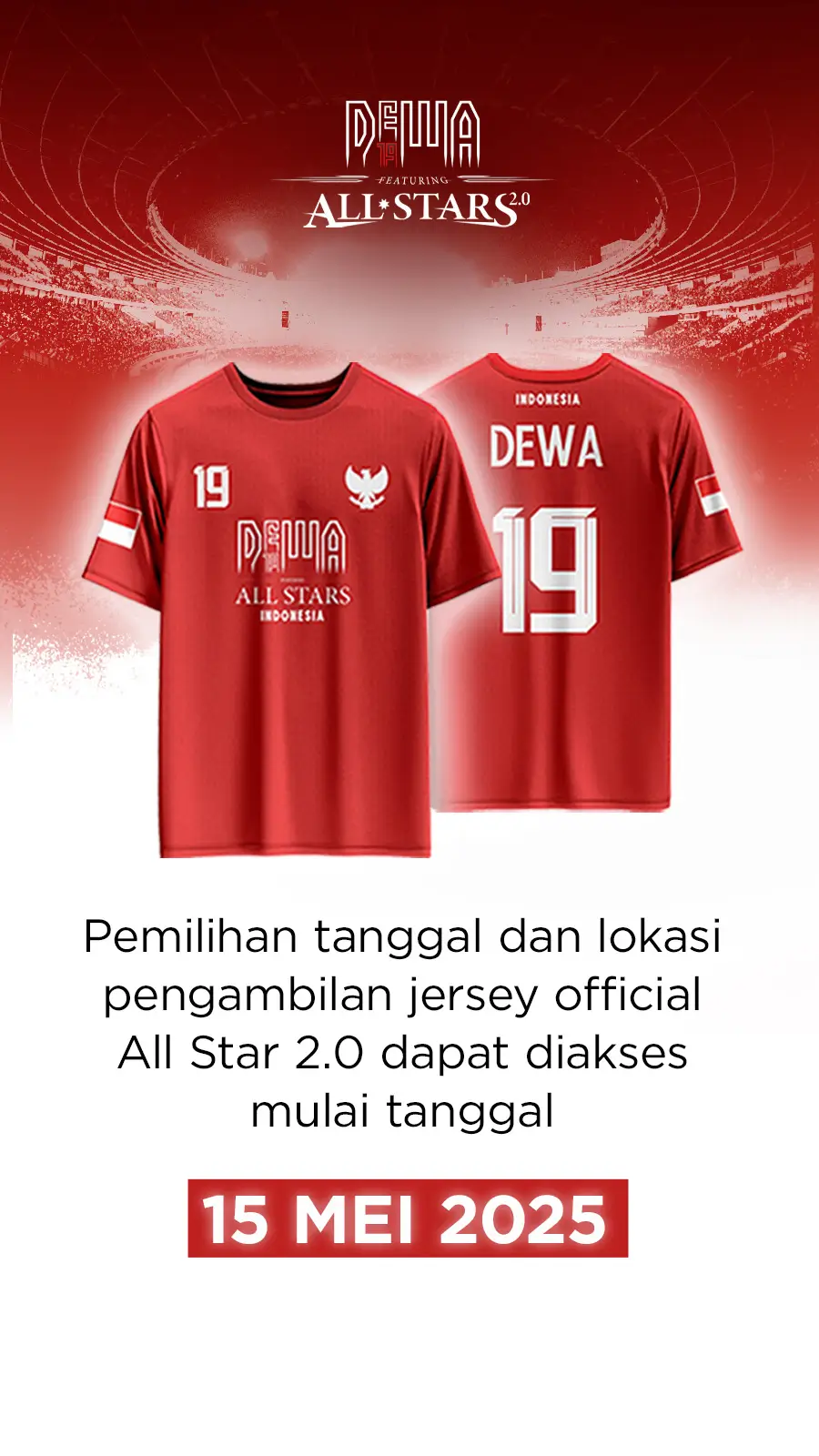 - Jersey Official All Stars 2.0 dapat dilakukan pengambilan di komplek GBK pada H-3 konser Dewa19 All Stars (bersamaan dengan penukaran tiket).